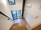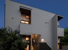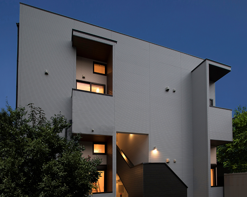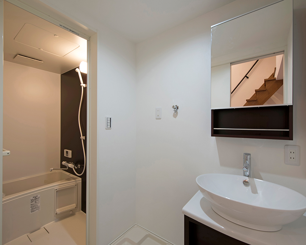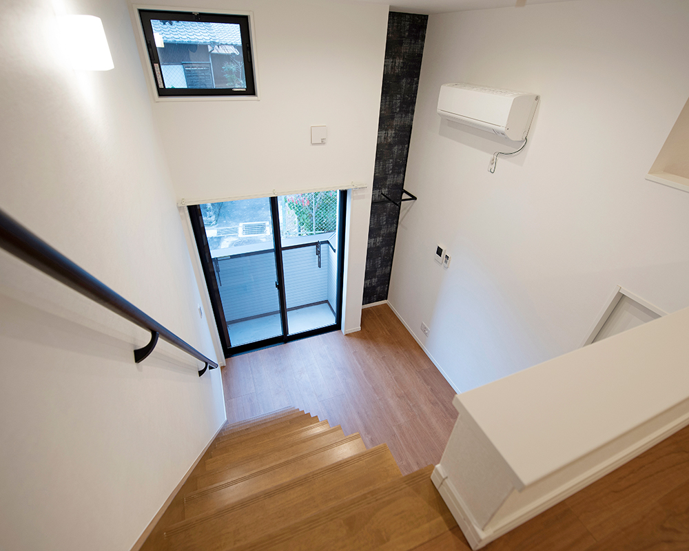 延長敷地で入り組んだところにあるため外壁に白をチョイス、バルコニーに木目をいれて優しいアクセントをプラスしております。
