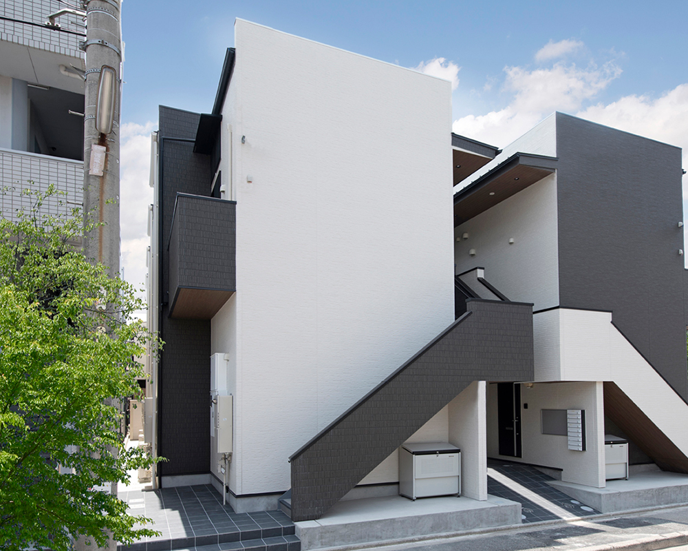 隣接する物件とアシンメトリーにしたデザイン性のある外観であり、
