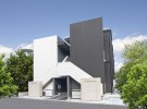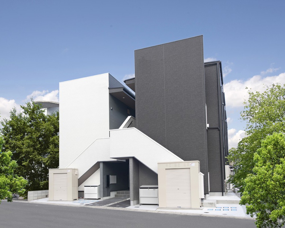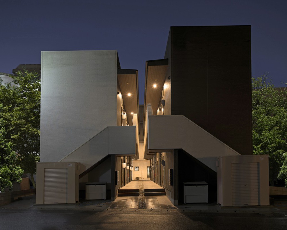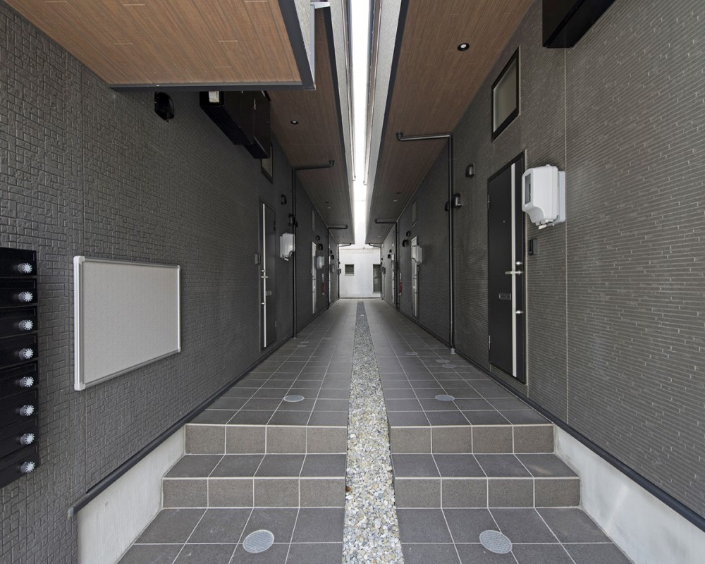 二棟の配置を東西に一間程度ずらすことで、入口が向かい合わせとなっていてもプライバシーを保つことのできるエントランスとなっています。
