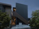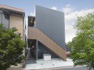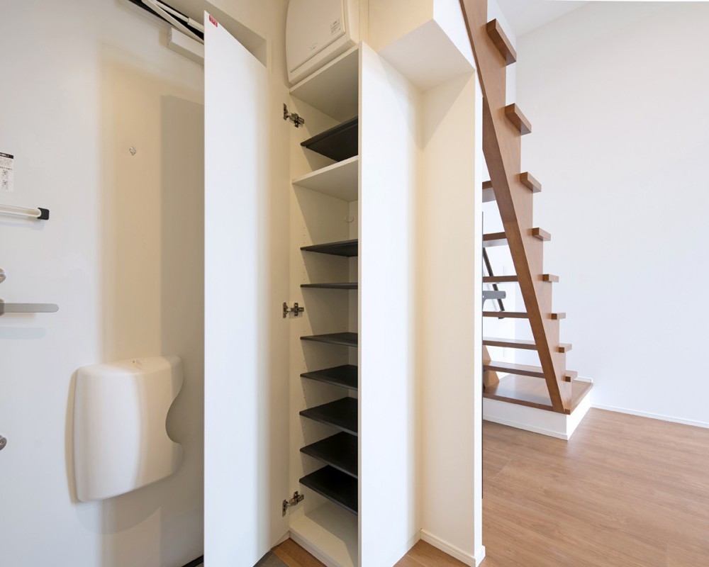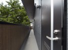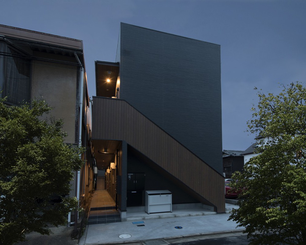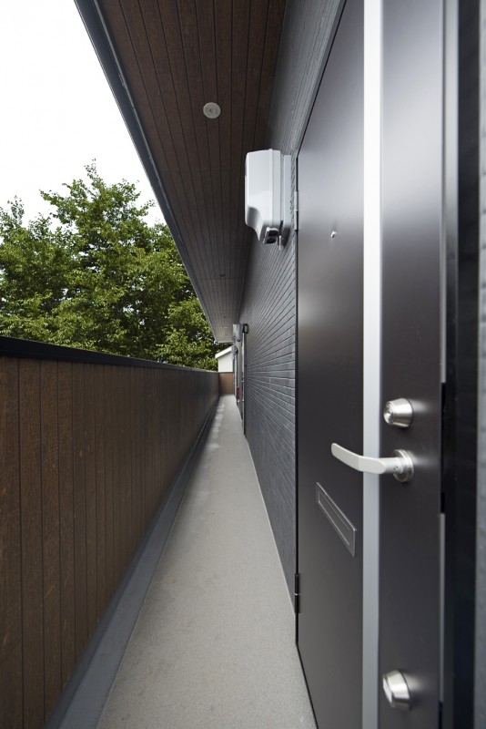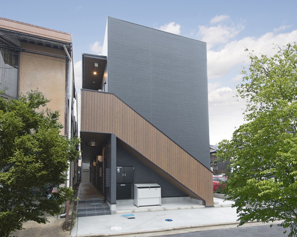 屋外階段と廊下部分の木質サイディングがアクセントとなっている、外壁の質感が美しい物件。