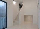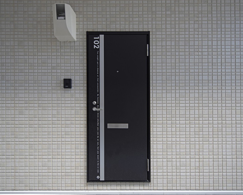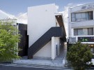 白い外壁に黒い手摺壁がアクセントとなっている外観。