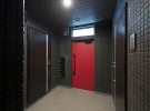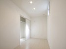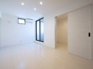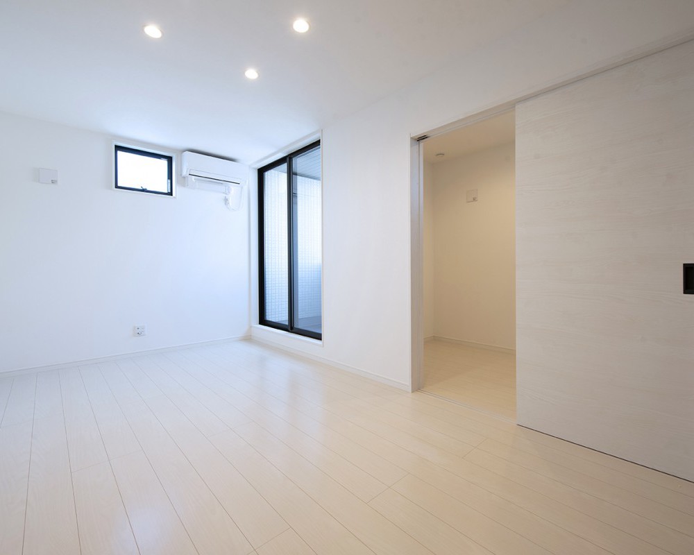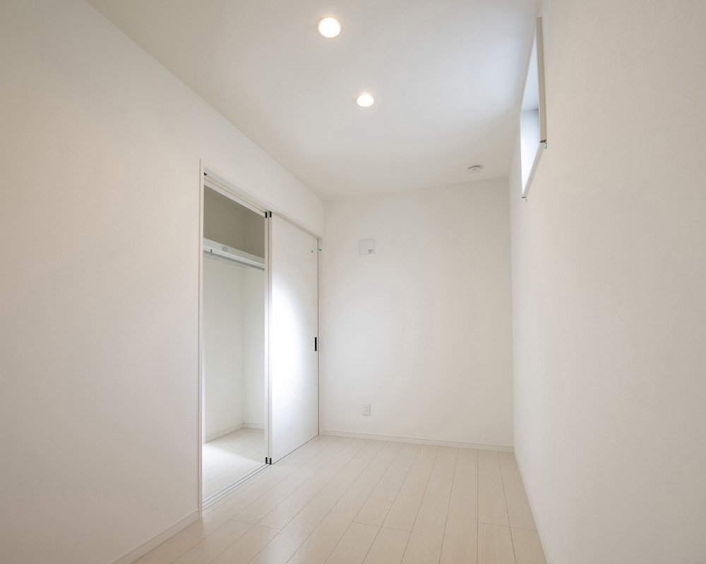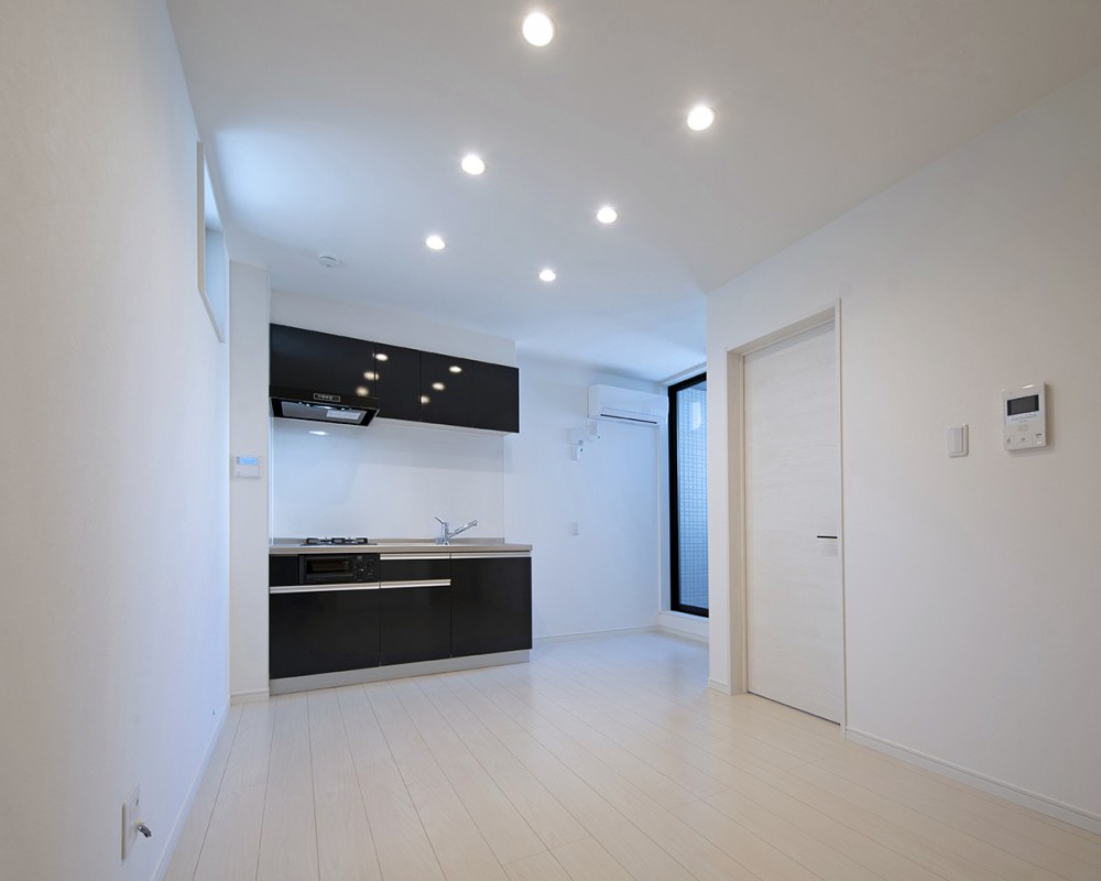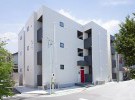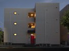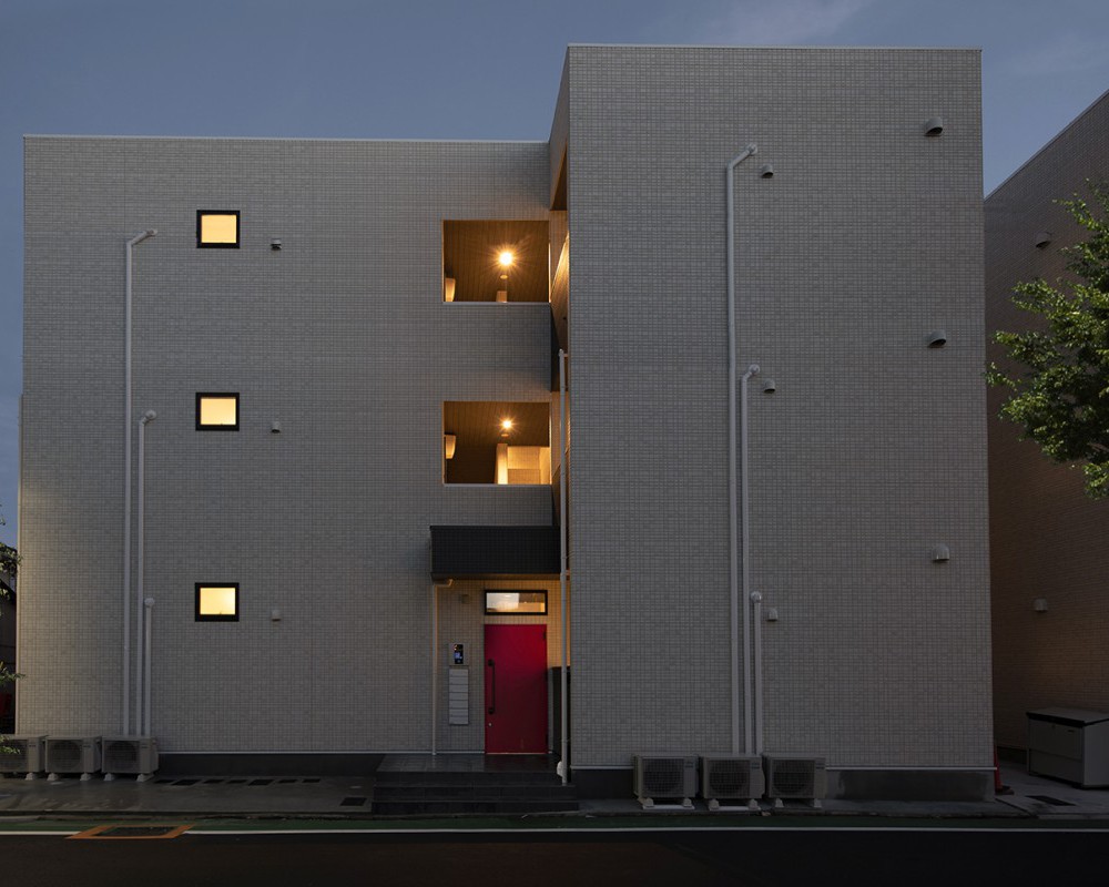 四角く角ばった無機質な外観のアクセントとなっている小さな滑り出し窓。夜になるとその窓からこぼれる灯りがほのかな愛らしさを演出します。