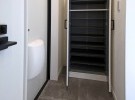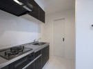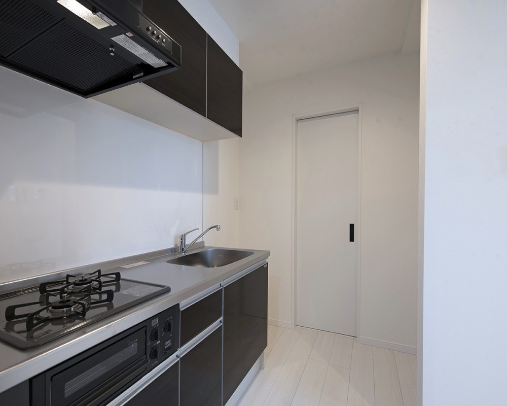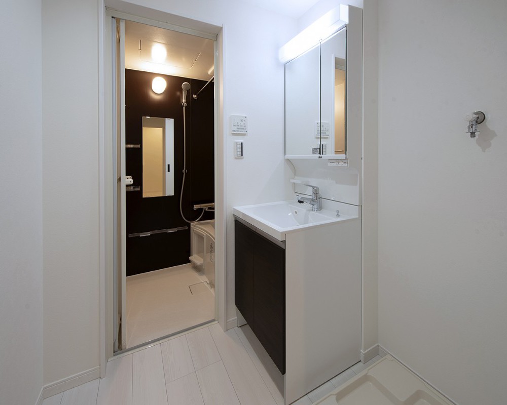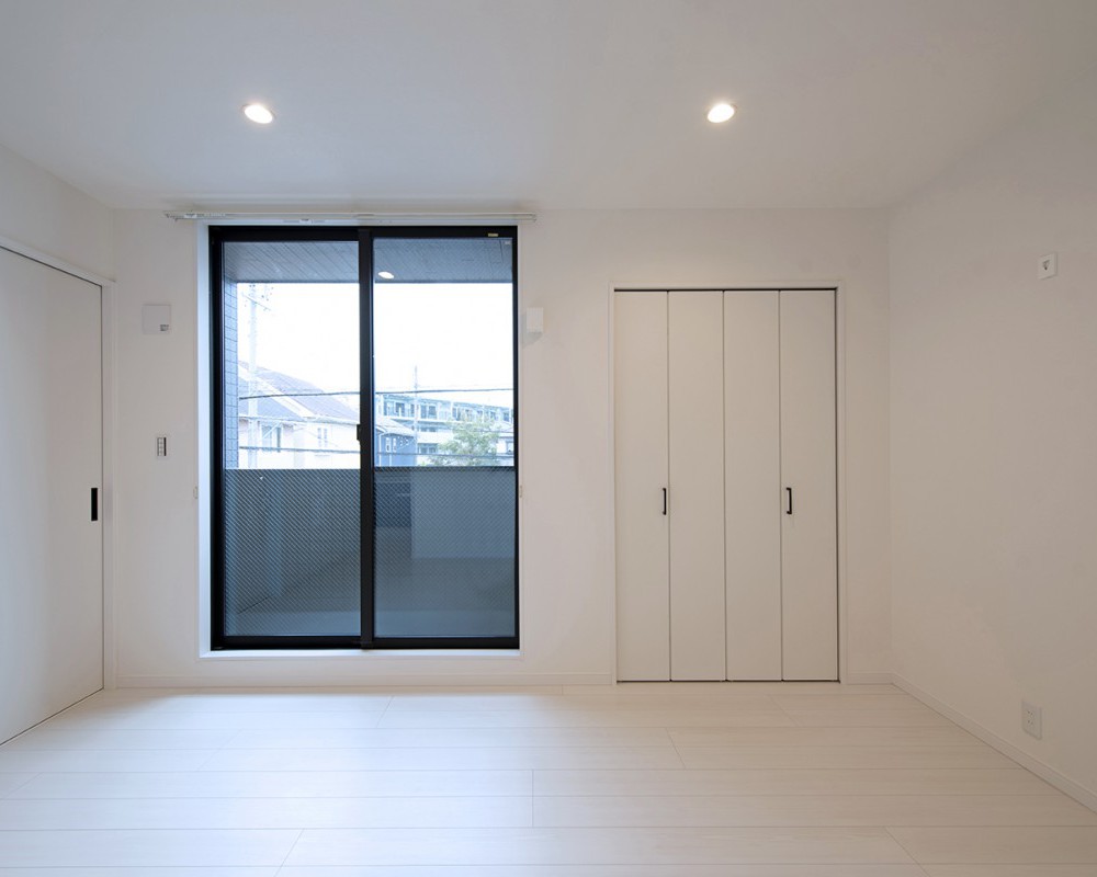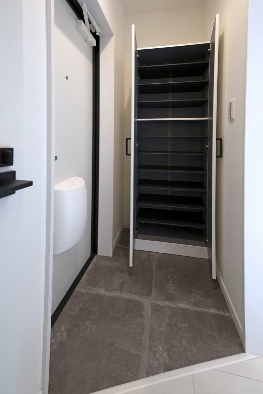 黒一色の大きな壁面に整然と並んだ開口部が美しい外観。各室に必要な寸法を取りながらキッチンと洗面脱衣室に収納スペースを設けた、心遣いのある間取りです。