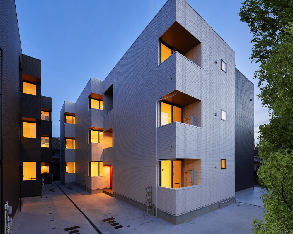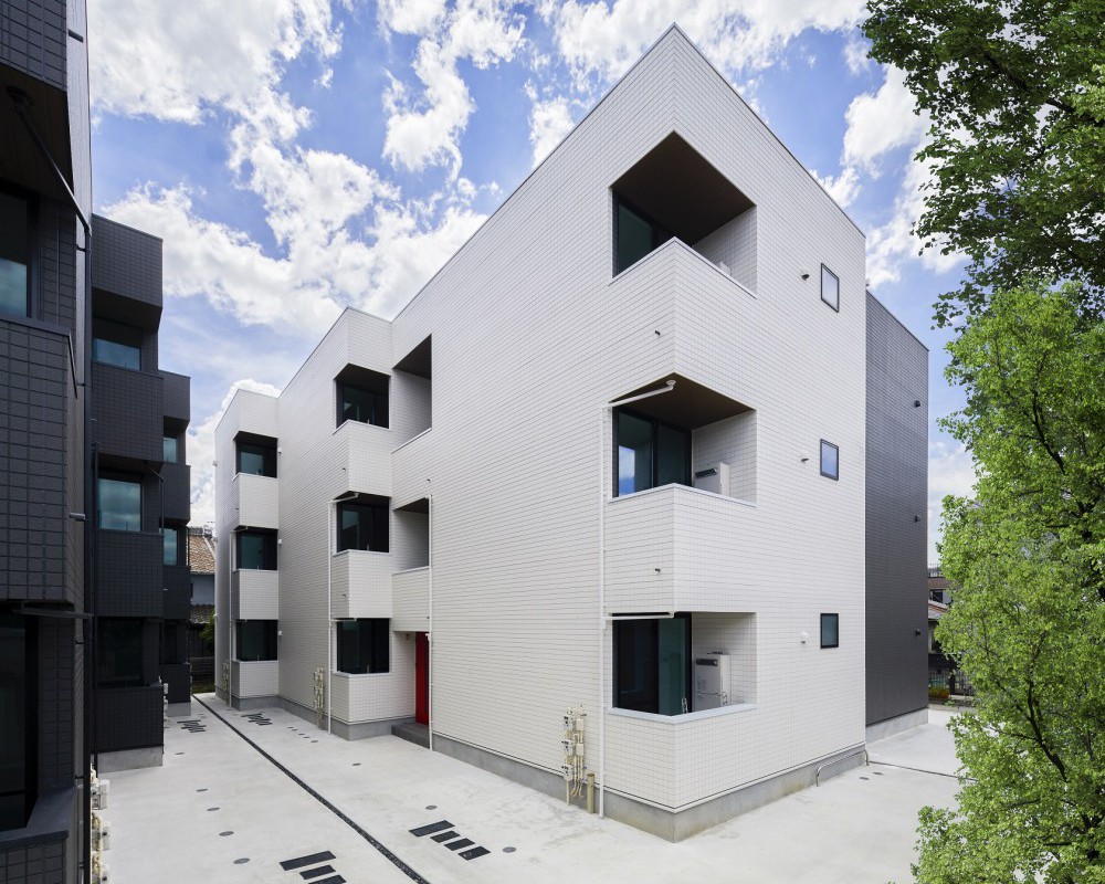 並びの中央のみ異なる色柄の外壁を選定し、白さと軽やかさを際立たせました。