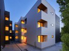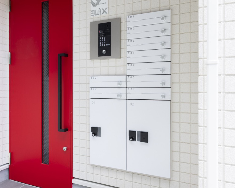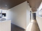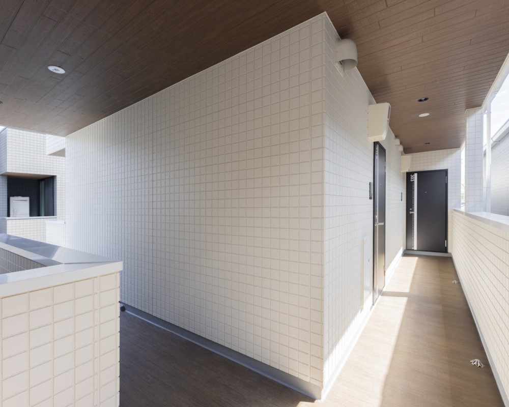 グリッド模様と建物隅の矩から受ける堅牢なイメージをやわらげ、連棟全体としての景観にアクセントを与えます。