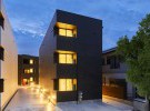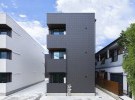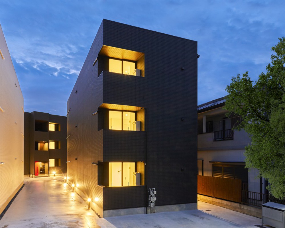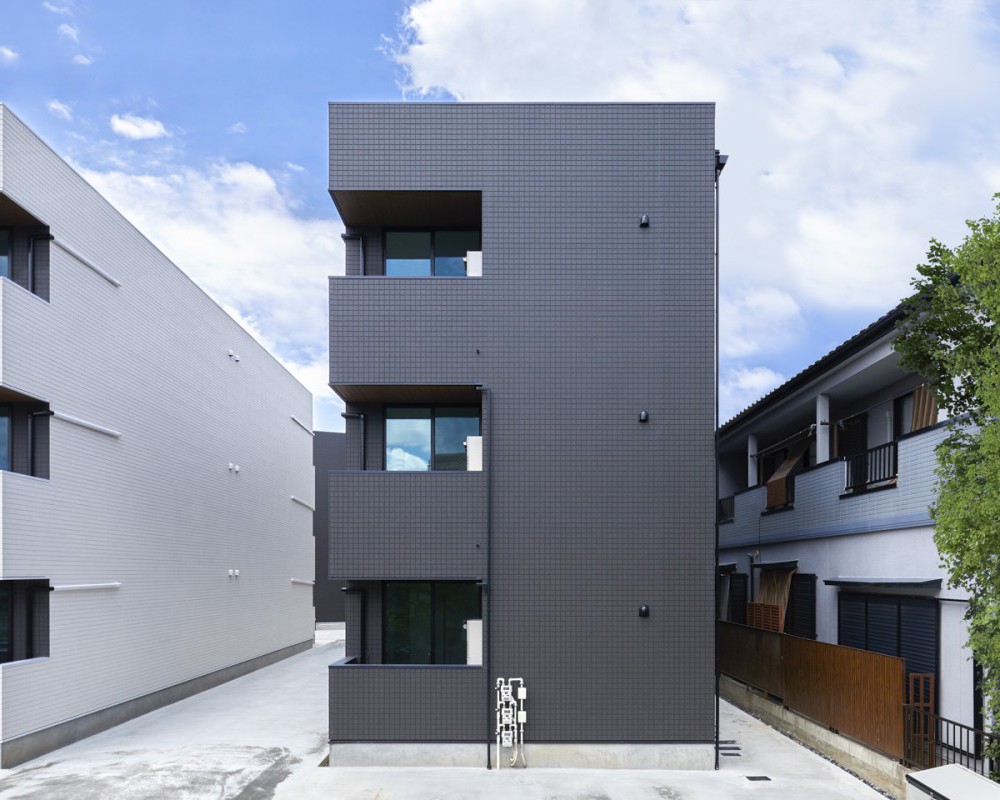 河川敷の並木が生い茂る道路に面して建てられた3棟のうちの1棟。