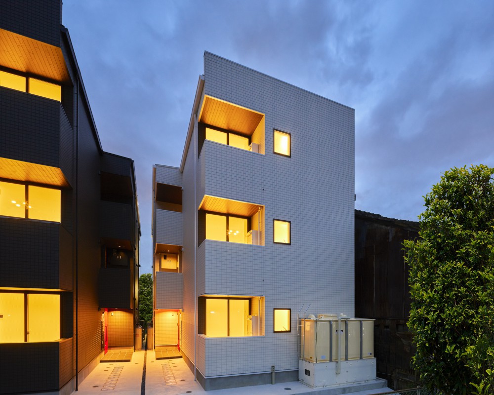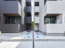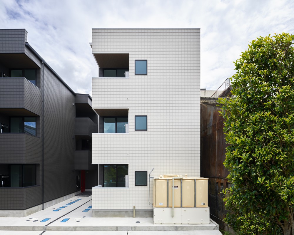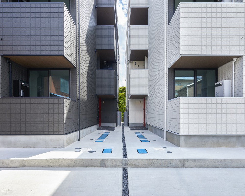 線対称で建てられた白と黒の棟並びは、二棟の奥まった位置にあるメインエントランスまで整然としたアプローチの役割を担っています。