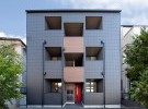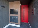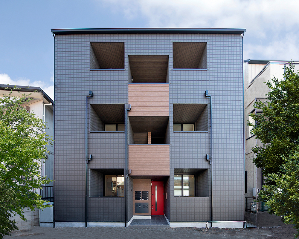 外壁を黒をメインにし、物件中央に木目をいれることであたたかみを演出。